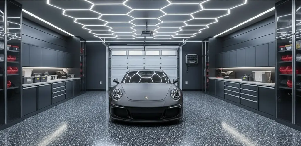 Modern lighting systems that improve visibility, elevate the look of your garage, and create a clean, professional environment.
