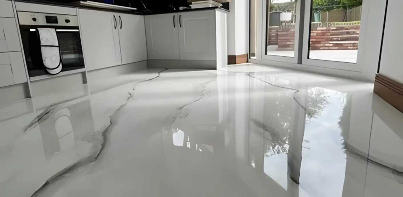 Luxury marble-inspired epoxy flooring with custom veining and a high-gloss finish that creates a sophisticated, one-of-a-kind surface. This decorative epoxy system combines the elegance of natural stone with the durability and easy maintenance of professional epoxy coatings.