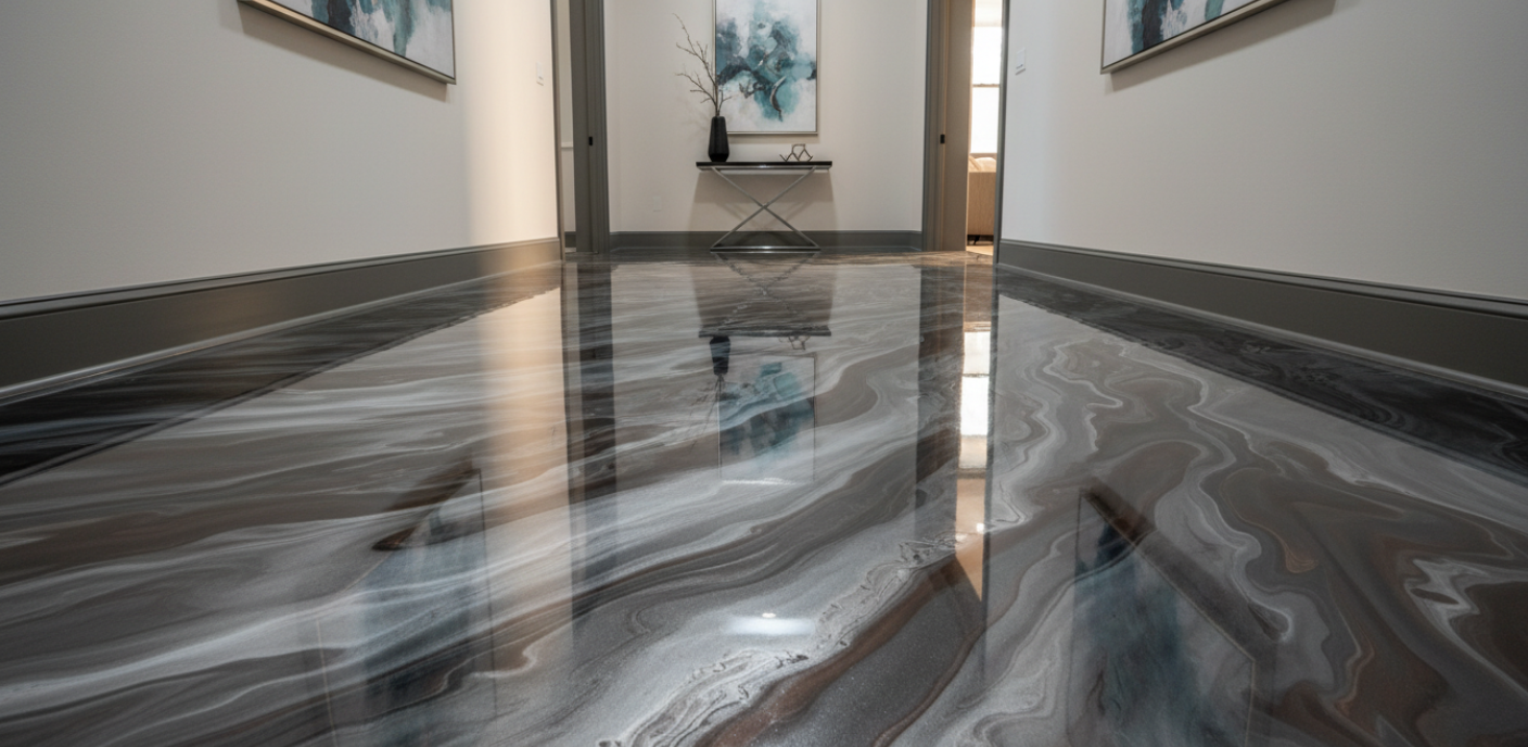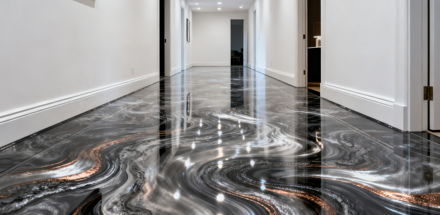 Metallic epoxy creates a striking, fluid design with depth, movement, and a high-gloss reflective finish. Each floor is completely unique, delivering a premium look similar to marble or liquid metal while providing the durability of a professional epoxy coating.